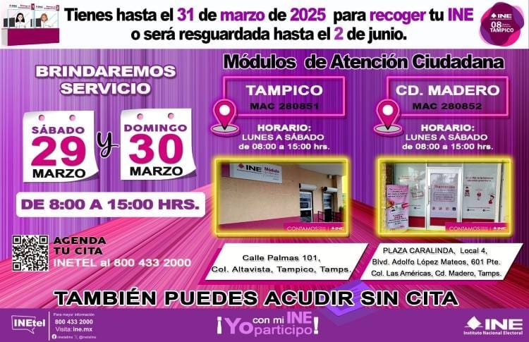 En el marco del Proceso Electoral Extraordinario del Poder Judicial de la Federación 2024-2025, la Lic. Elvia Nazllely Saucedo Martínez, Vocal del Registro Federal de Electores de la 08 Junta Distrital Ejecutiva con sede en Tampico, Tamaulipas, hace un llamado urgente a la ciudadanía para que acudan a recoger su Credencial para Votar. La fecha límite para este trámite es el próximo 31 de marzo.