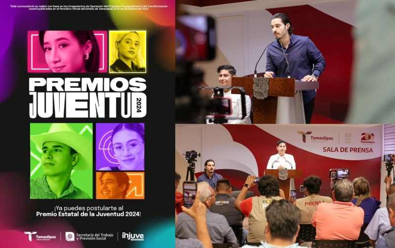 Ciudad Victoria, Tamaulipas.- El secretario del Trabajo y Previsión Social de Tamaulipas, Gerardo Illoldi, y el director estatal del INJUVE, Oscar Azael Rodríguez Perales presentaron ante los medios de comunicación, la convocatoria del Premio de la Juventud 2024 con una bolsa de un millón de pesos en premios para los ganadores de ese certamen, donde 20 jóvenes serán acreedores de un premio de $50,000 en efectivo por cada primer lugar con el objetivo de reconocer el potencial de las juventudes activas en la sociedad actual.
