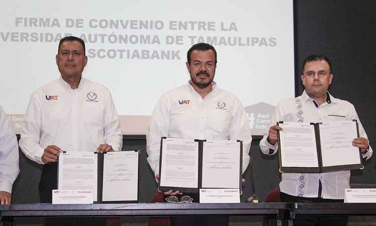 En el Campus Tampico se llevó a cabo la firma de un convenio de colaboración que presidió el rector Guillermo Mendoza Cavazos con la institución financiera Scotiabank, para seguir fortaleciendo el fondo destinado al personal docente de carrera al servicio de la UAT.