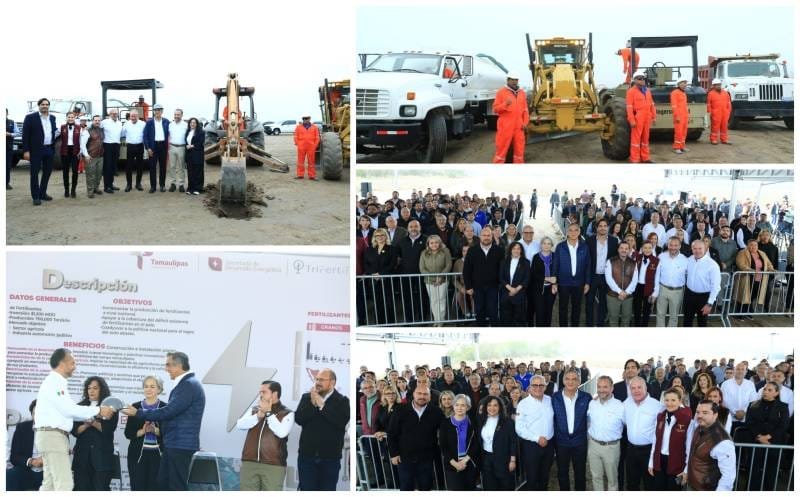 Reynosa, Tamaulipas.- Con una inversión histórica de mil 300 millones de dólares y con el objetivo de coadyuvar a incrementar la producción en el campo mexicano, el gobernador Américo Villarreal Anaya presidió el arranque de obra de la planta de fertilizantes, que tendrá una producción de 700 mil toneladas anuales y generará mil 500 empleos directos durante su construcción.