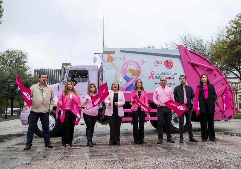 Cinco camiones de recolección de residuos, pintados de rosa, salieron a su labor cotidiana tras el banderazo realizado por autoridades municipales y directivos de la empresa.
