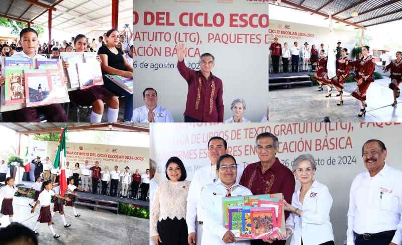 Durante la ceremonia cívica en la Escuela Primaria Francisco Zarco, del ejido San Antonio, municipio de Jaumave, y acompañado por la presidenta del DIF Tamaulipas, doctora María de Villarreal; el secretario general de la Sección 30 del SNTE, Arnulfo Rodríguez Treviño, y Rodrigo Castillo Aguilar, representante de la secretaria de Educación federal Leticia Ramírez Amaya, el gobernador entregó paquetes de útiles, uniformes y libros de texto gratuitos, ahí reiteró que su gobierno estará atento para mejorar las instalaciones educativas a través del ITIFE.