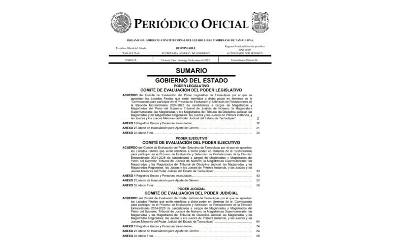 Dichos listados corresponden a la convocatoria del “Proceso de Evaluación y Selección de Postulaciones de la Elección Extraordinaria 2024-2025” para cargos como: Magistradas y Magistrados del Pleno del Supremo Tribunal de Justicia de Número; Magistratura Supernumeraria; Magistradas y Magistrados del Tribunal de Disciplina Judicial; Magistradas y Magistrados Regionales; Juezas y Jueces de Primera Instancia y, Juezas y Jueces Menores del Poder Judicial del Estado de Tamaulipas.